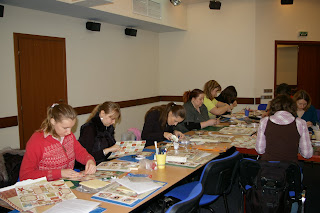 Всем участникам были розданы наборы для МК ,пошаговая иснтрукция к МК ( Кэролин специально написала и прислала их нам заранее, а с переводом нам очень помогла Настя (gypsyscrap). Настя, большое спасибо!!! + еще каждому была заготовлена наглядная цветная распечатка - как пример всех будущих страничек, которые предстояло сделать.Все принадлежности для работы, инструменты, расходные материалы - в полном объеме были предоставлены клубом каждому участнику. Проводился МК все в том же зале, т.к. желающих поучаствовать было много.